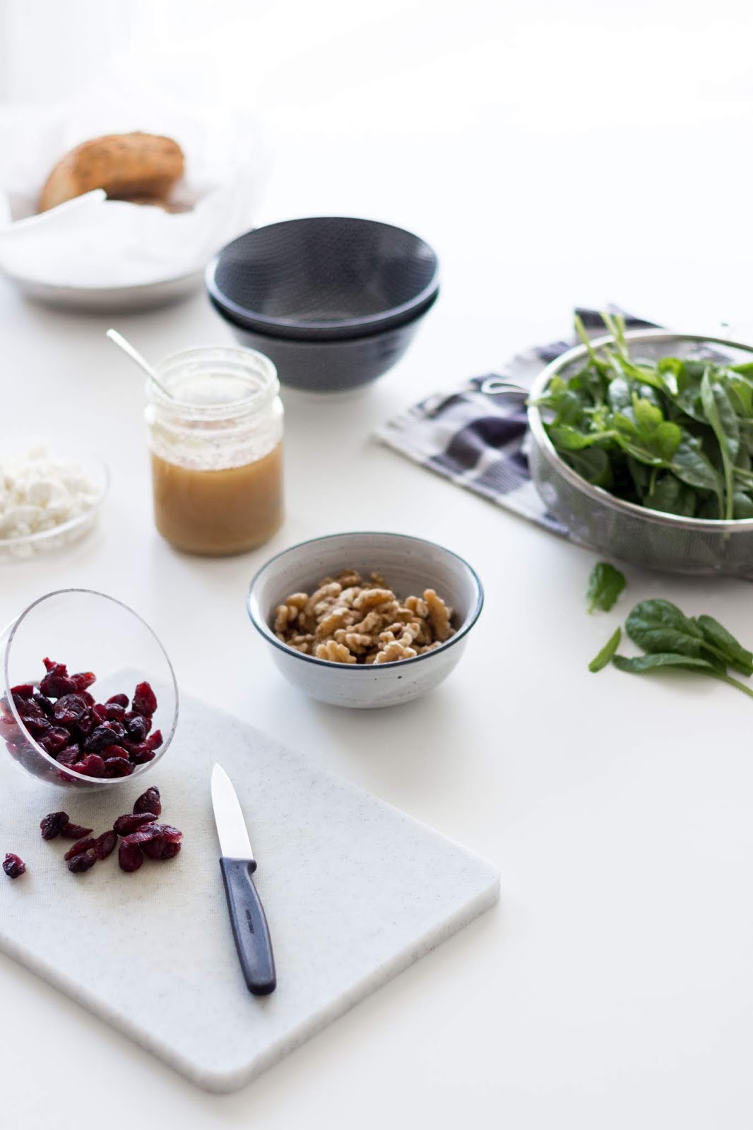 Den Spinat putzen, waschen und in eine Salatschüssel geben. Auf einem Brett die Walnüsse vorsichtig mit einem Messer in kleiner Stücke hacken und über den Salat geben. Den Schafskäse zerkrümeln und und die Cranberries ebenfalls verteilen. Mit einem Teelöffeln etwas Honig über den Salat träufeln. Für die Salatsoße Olivenöl, Balsamicoessig, Salz und Pfeffer vermischen und über den Salat geben. Dieser kann anschließend in zwei Schüsseln verteilt werden und am besten mit einem Stück Brot oder Körnerbrötchen serviert werden.